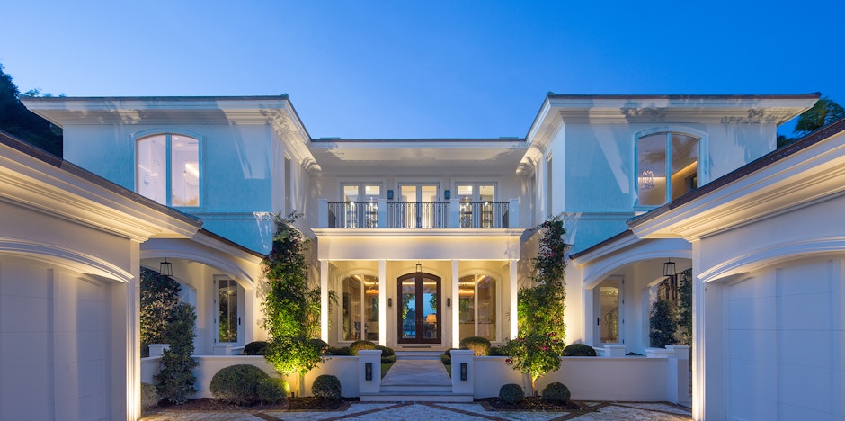 To the rear of the property palm trees fringe a swimming pool with spa, whilst a cabana bar provides ample hosting space. Within the house, the two ‘wings’ are given over to either formal entertaining; with a lounge, bar, games and dining room, or family relaxation with an open plan kitchen and living area.Gallery
