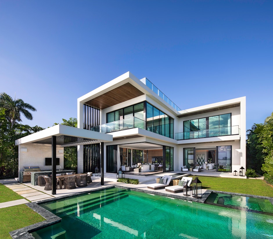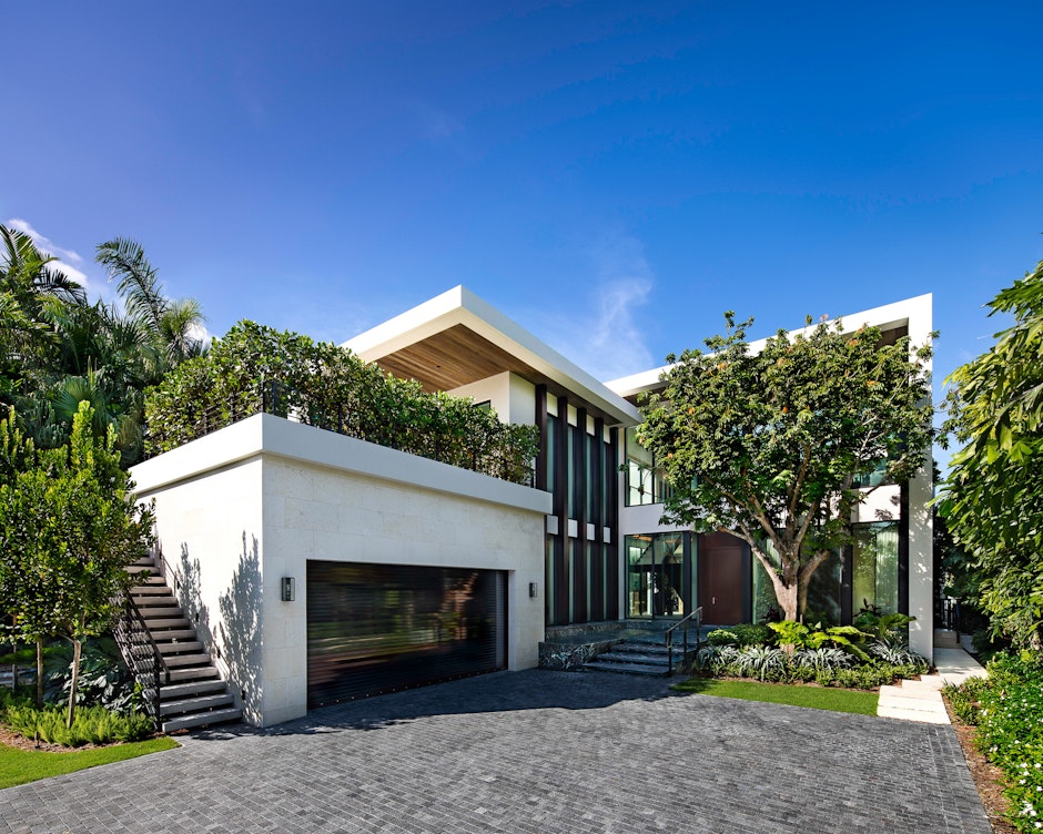 Sunset House, is a newly constructed 10,000 sq ft (929 sq m) home located on Sunset Island. This 6-bedroom luxury home is architecturally unique, and features glass walls and sliding doors facing the central courtyard and outdoor space maximising light and views.