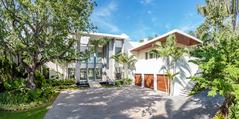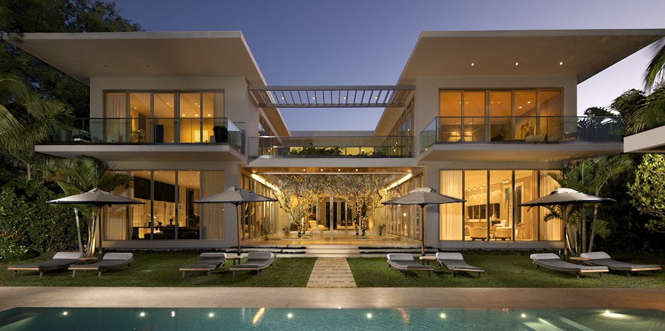 Sunset House, is a newly constructed 10,000 sq ft (929 sq m) home located on Sunset Island. This 6-bedroom luxury home is architecturally unique, and features glass walls and sliding doors facing the central courtyard and outdoor space maximising light and views.